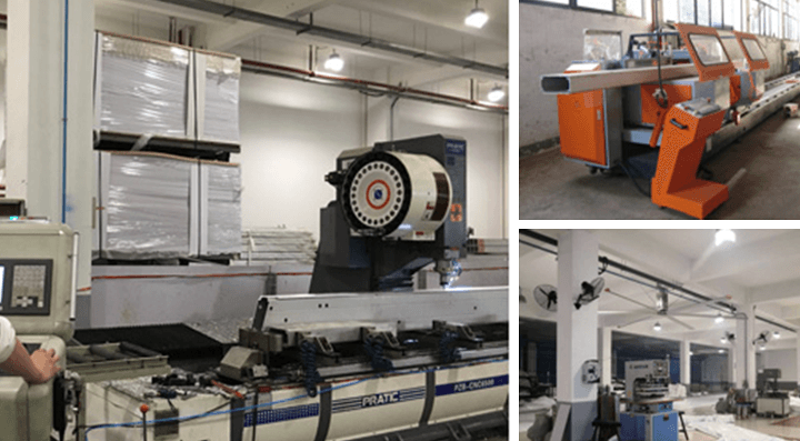 型材首先使用大型雙頭切割鋸切割,而后使用大型加工中心鉆銑加工,保證篷房的加工精度與一致性。